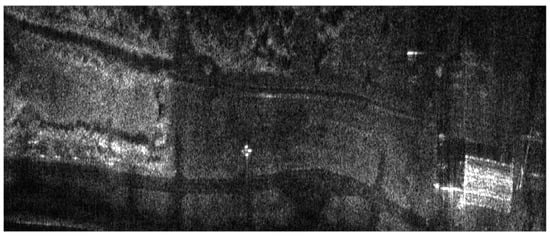 The influence of the navigation corrections obtained from the proposed INS/GPS system on SAR terrain images was determined using the WATSAR aerial system equipped with a Ku band (15.9 GHz) synthetic aperture radar []. The imaged area is shown in Figure 7, an image obtained without the use of navigation correction is presented in Figure 8, the image shown in Figure 9 was obtained using corrections originating from the INS system, while Figure 10 contains an image calculated using the INS/GPS system data. During the imaging, an aperture length of 501 elements and a rectangular window were used.