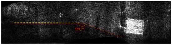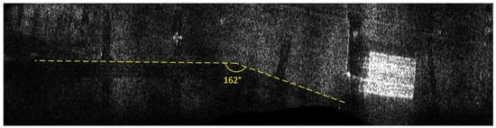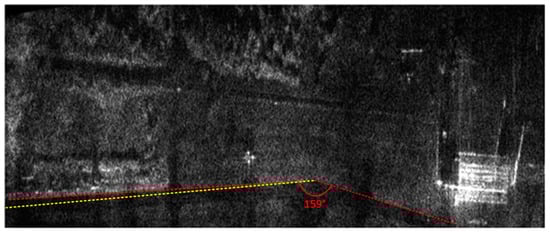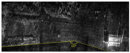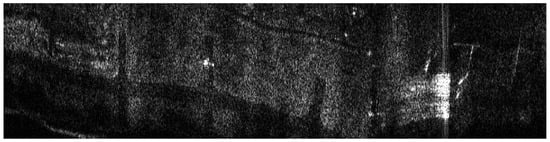 Due to the use of INS/GPS based MOCO, the test image had a better (higher) contrast (IC) than the image obtained without the correction (IC = 7.56 compared to 4.06). On the other hand, this result was worse (lower) than the image contrast obtained with the use of INS-based MOCO (IC = 8.32) [,]. A similar effect related to the image entropy (E). The lower the entropy was, the better the image was focused []. Due to the use of INS/GPS corrections, the entropy of the test image dropped from 14.43 (the image without MOCO) to 13.94. Again, this result was slightly worse than the entropy of the image obtained with the use of INS-based MOCO (E=13.83).