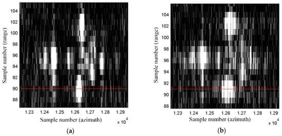 Image of the arrow made of corner reflectors: (a) with the INS-based motion compensation (MOCO), (b) with the INS/GPS-based MOCO; red line—an analyzed row.