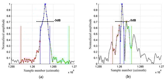 Main lobe (blue line) and side lobes (red and green lines) of the selected corner reflector synthetic aperture radar (SAR) image: INS-based MOCO (a), INS/GPS based MOCO (b).