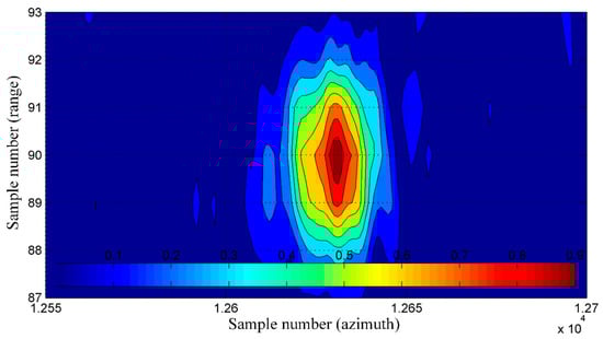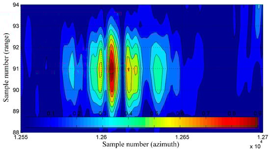 A graph of a normalized amplitude of image pixels lying on the mentioned line is shown in Figure 12. For an even more intuitive visualization, normalized amplitudes of image pixels lying on several lines containing the considered corner reflector are presented in Figure 13 and Figure 14 as colored contour plots.
