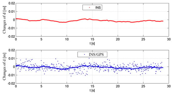 A comparison of changes of the vertical component of the unmanned aerial vehicles (UAV) position vector in one measurement session for the INS and the INS/GPS systems.