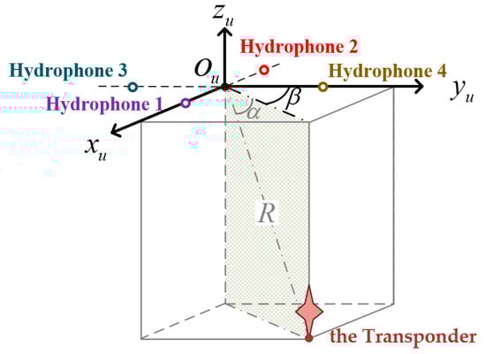 As shown in Figure 2, the USBL position system consists of four vehicle-mounted hydrophones and a known-location transponder (denoted as ). The four hydrophones are arranged in two orthogonal baselines and make up the USBL array. The intersection point of two baselines is the origin of the USBL array frame ( frame) and the right-handed frame are then shown as follows: