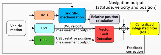 As discussed above, the single navigation device cannot maintain the accuracy of polar navigation. Therefore, a polar grid SINS/DVL/USBL integrated navigation algorithm is proposed to enhance the navigation performance for vehicles. In this section, the grid SINS/DVL/USBL filter model is designed for the proposed integrated algorithm. The DVL provides the absolute velocity while the USBL provides the relative position as the external navigation information. Figure 3 shows the diagram of the proposed grid SINS/DVL/USBL integrated navigation algorithm. The design details of the algorithm will be discussed in the following subsections and Section 4.