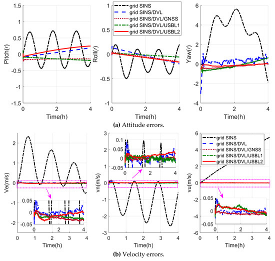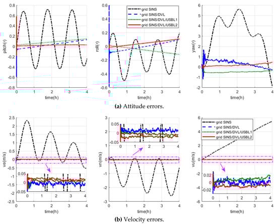 Though the R measurements and angle measurements, i.e., and , which are both provided by the USBL, the fault of the two kinds of measurements are independent from each other. During the time 8261 to 8450 s, the integrated filter is challenged by both the velocity measurement fault from DVL and the R measurement fault from the USBL. Then the DVL and R measurements are located by the detection flag vector and isolated by the reconstruction. And meanwhile the filter is still operating with the and measurements to ensure the grid SINS errors were restrained uninterrupted during the short time. However, if the traditional scalar fault detection method is employed to isolate the simultaneous R and DVL fault, or the absolute position is employed as measurements, all the measurements would be isolated and the filter would be interrupted. As a result, the grid SINS errors would not be restrained by integration and the navigation accuracy would decrease sharply. Compared with the traditional scalar method, the vector method can improve the utilization of effective measurements and navigation performance.