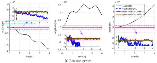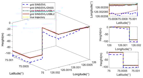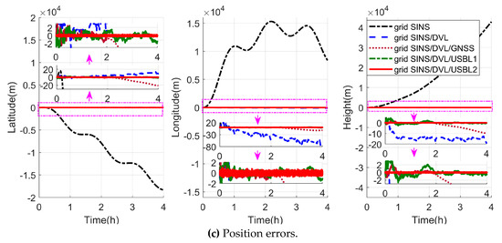 As shown in Figure 11, the proposed navigation algorithm can conquer the error amplification caused by the meridian convergence because of the grid navigation frame. As shown by the black curves, the grid SINS output still contains the periodic oscillation error and accumulated error, and the integration technique can restrain the grid SINS errors effectively with the help of velocity or position measurements from the DVL, GNSS and USBL. Besides, firstly the grid SINS/DVL, grid SINS/DVL/GNSS and the grid SINS/DVL/USBL integrated algorithm have nearly the same accuracy of attitude and velocity, but the position errors of the grid SINS/DVL integrated algorithm still accumulate with time. Secondly, when the vehicle operates on the surface, the position errors of the grid SINS/DVL/GNSS and the grid SINS/DVL/USBL do not accumulate, but when the vehicle navigates under water, the GNSS signals are lost and position performance between two navigation strategies becomes larger. Figure 12 shows the position comparison between four integrated navigation strategies. According to Figure 11 and Figure 12 and Table 5, the position accuracy of the proposed grid SINS/DVL/USBL 2 is higher than that of the traditional grid SINS/DVL/USBL 1 and compared to algorithm1, the latitude, longitude and height accuracies of algorithm2 are improved 87.38%, 63.84%, 91.73% (maximum error), and 87.01%, 65.26%, 89.36% (RMS), respectively. The maximum errors of latitude, longitude and height are reduced from 2.9663 m to 0.3742 m, 2.8152 m to 1.0179 m, and 2.5741 m to 0.2127 m, respectively, which can maintain the position accuracy of ocean space vehicles in polar regions.