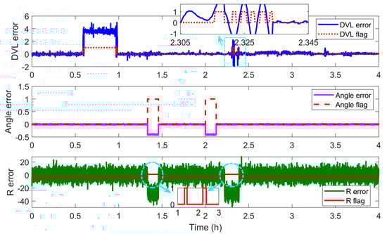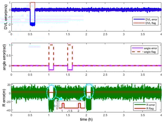 As description in the Section 4.2, the measurements are classified as three measurement groups according to the independence of fault’s occurrence, i.e., the range R from the USBL, the direction angles from the USBL and the velocity from the DVL. The R flag is the fault detection flag of the USBL measurement R. The angle flag is the fault detection flag of the USBL measurement . The DVL flag is the fault detection flag of the DVL measurement. If no fault occurs, the corresponding flag is 0. If some fault occurs, the corresponding flag is 1. The detection flag vector contains three elements, i.e., the DVL flag, angle flag and R flag. The fault measurement can be identified by its flag in the vector. The measurement errors and corresponding flags are shown in Figure 6.