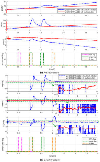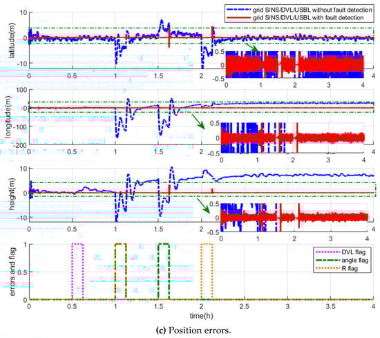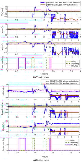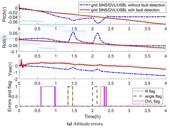 The measurement errors and the fault detection flags are shown in Figure 13, and the navigation errors of the fault-tolerant grid SINS/DVL/USBL integrated algorithm are shown in Figure 14.