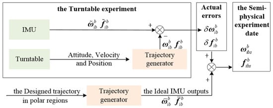 The signal flow to get the actual IMU output errors, i.e., and , and the semi-physical experiment data, i.e., and , is shown as Figure 8.