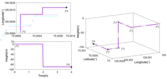 As shown in Figure 10, the first three waypoints of the vehicle trajectory (P1–P3) are on the surface where the GNSS can provide position coordinates. Then the vehicle descends to depths of about 90 m where the GNSS signals are lost and the grid SINS/DVL/GNSS strategy is switched to the grid SINS/DVL strategy.