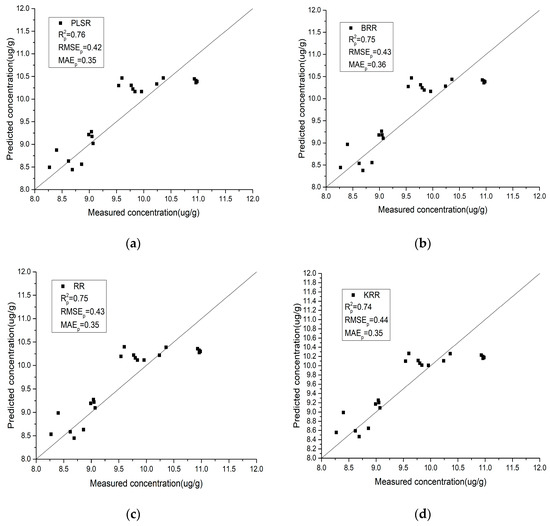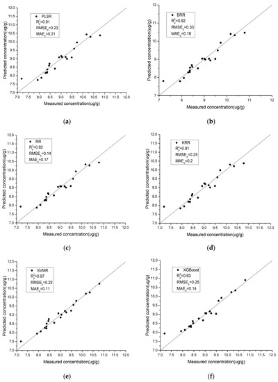 Using the characteristic bands selected by IRIV-SCA, the relationship between the estimated and predicted values of the model validation set samples is shown in Figure 7 and Figure 8. The closer the scatter plots of the predicted and measured values are, the higher the accuracy of the model. By comparing the scatter plots of the different regression methods in the modeling process, the following conclusions can be drawn: