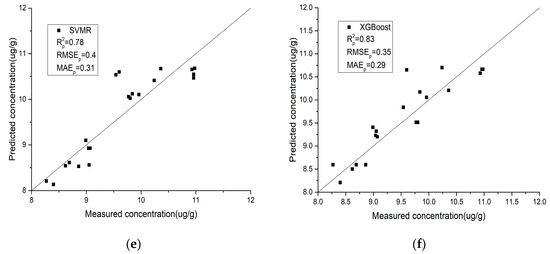 - For the laboratory spectra, SVMR obtains the highest R2 and the lowest RMSE and MAE values. This is shown in Figure 7e, where the black scatter points are located closest to the y = x line, and the trend is the most consistent with the y = x line. PLSR obtains the lowest R2 and the highest RMSE and MAE values. This is shown in Figure 7a, where the black scatter points are located close to the y = x line, but a few points exhibit slight deviations. For the field spectra, XGBoost obtains the highest R2 and the lowest RMSE and MAE values. This is shown in Figure 8f, where the black scatter points are located close to the y = x line and the trend is more consistent with the y = x line. RFR obtains the lowest R2 and the highest RMSE and MAE values. This is shown in Figure 8g, where the black scatter points exhibit large differences.