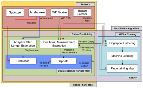 The sensors include motion sensing devices and radio modules in the phone. The radio modules consist of iBeacon and WiFi receivers, and they offer RSS values obtained from iBeacon transmitters and WiFi APs for localization algorithms. The motion sensing devices contain the gyroscope used to obtain the orientation and angular velocity and the acceleration gauge used to determine a three-axis accelerations. Sensing information obtained from IMU devices (gyroscope and accelerometer) and radio modules are employed for position estimate in the localization schemes, including the DSPF algorithm and machine learning.