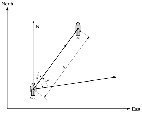 The reduced scheme of the pedestrian model used in our positioning approach is shown in Figure 2. The user’s x-axis and y-axis coordinates in indoor space at timestep k can be written as state vector . For the pedestrian model, direction information at times k and are indicated by the angles and respectively, and a counterclockwise angle between state vector and is represented by the value of . The user’s displacement (step length) between times and k is denoted by the value of d.