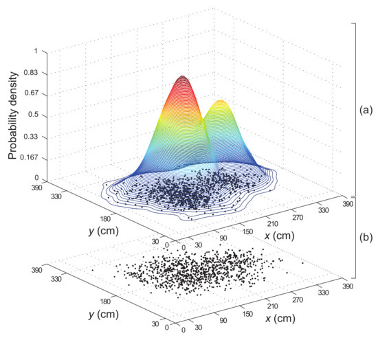 - For the enhanced PF, the likelihood of positional measurements is represented by the target distribution, which is generated based on point mass representations using positional measurements obtained from the measured WiFi and iBeacon RSS values and pedestrian direction data using the fingerprinting algorithm. The RSS data received from WiFi and iBeacon APs permits the target distribution to reflect indoor wireless environments surrounding the user. Unlike the localization schemes [11,22,23,24,25,26] shown in Table 1 that calculate the weight of samples through the parametric density estimation, the particle weight in the enhanced PF is determined by calculating a probability density function of the target distribution using the Parzen-window density estimation for better positioning results.