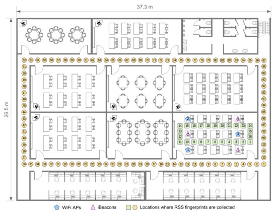 During the offline step, the pedestrian direction data mentioned in Section 3.1 along with the RSS values measured from the iBeacon transmitters and 802.11 access points are recorded using the smartphone of the user at the positions predetermined for the localization indoors, similarly as in Wi-Fi fingerprint-based approaches that uses the heading direction to improve the RSS-to-position mapping [10,42,43]. Then, the recorded fingerprint data as training information are transmitted to the server and are converted into fingerprinting map by the machine learning method.