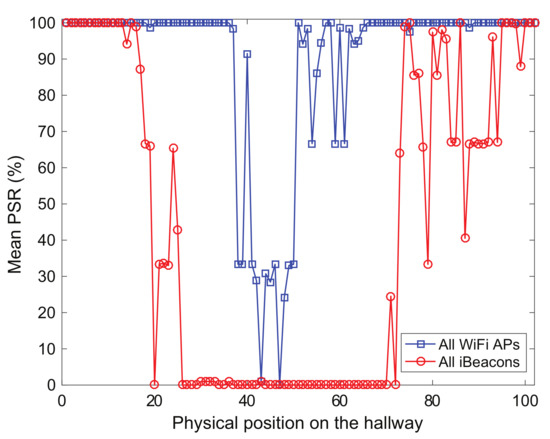 The mean packet success rate computed using RF signals from the transmitters in the hallway (orange circles) of TC2 is shown in Figure 5. The RF signals from the transmitters can be used to compute the packet success rate corresponding to each RF transmitter. The mean packet success rate can provide a reasonable indication of how the wireless environment is good at a given location. For example, the farther the pedestrians walk on the physical locations from the RF transmitters, the more the packet success rate decreases, as shown in Figure 5 that indicates the mean packet success rate obtained from pedestrians’ smartphones for each test position of TC2. The mean packet success rate values for the iBeacons and WiFi APs at all physical locations for TC2 are approximately 44% and 90% respectively, while those for TC1 are about 100%, together. Note that the positioning systems in this experiment use only the RSS values obtained from the RF transmitters to locate the user, but do not require to receive communication packets from them.