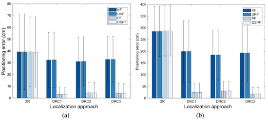 For test cases TC1 and TC2, the means and standard deviations for the positioning error obtained by the Bayes filters from 50 pedestrians are represented by Figure 6. This figure is illustrated by bar charts with error bars that consist of thin vertical lines and short horizontal line segments to show the reliability or precision in a set of position estimation values obtained from Bayes filters. The error bars are added to the bar charts based on the standard deviation for the positioning error obtained by the filters. Comparing results from DR, DRC1, DRC2, and DRC3 in Figure 6 reveals that the filters that employs both the DR and position correction can provide more accurate and reliable positioning results than those using only DR. Particularly, for TC2 with the bad radio environment, when DRC1, DRC2, and DRC3 are applied, the localization error for the filters is decreased remarkably. From Figure 6, we can also see that the performances of DRC1, DRC2, and DRC3 are not influenced largely by types of RSS values employed to obtain the observations of the user position. For all positioning algorithms in test cases TC1 and TC2, DSPF achieves lower positioning error compared with UKF and KF, while providing localization results that are as accurate as PF, as shown in Figure 6. Moreover, it is shown in Figure 6 that since DSPF accomplishes a smaller standard deviation for the localization error compared to Kalman filtering-based methods and provides comparable positioning error standard deviation to PF, it can carry out the position estimation that is as reliable as PF.