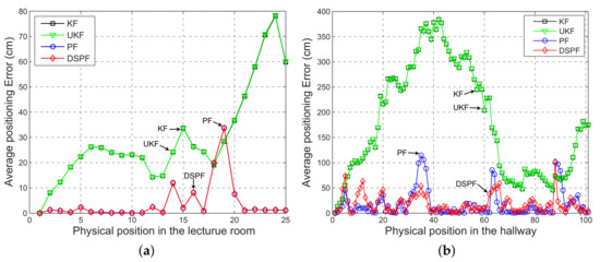 The positioning error can be analyzed in more detail by observing Figure 7 and Figure 8, which represent the average value of the positioning error and the user’s trajectory estimated by the localization scheme in which the Bayes filters are executed by DRC3 in test cases TC1 and TC2. For TC1, the positioning accuracy difference between DSPF and Kalman filtering-based methods is remarkable. Even for TC2 with the bad wireless conditions, the localization results of DSPF against UKF and KF are greatly enhanced, especially around the location numbers ranging from 20 to 60 with low values of packet success rate, as shown in Figure 5. This test results suggest that the localization system based on DSPF can offer reliable and accurate positions of the user even in the case where there are many obstructions or in bad wireless condition. This is probably because the DSPF algorithm can execute the position estimation adaptable to the change in indoor wireless environments by using the target distribution that reflects indoor wireless environments surrounding the user through the multiple observations, as described in Section 3.4.
