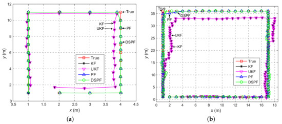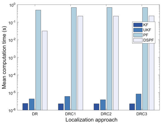 When the dimensions for the state and measurement are and respectively (i.e., and ), the computation time complexities for UKF and KF are generally and respectively [51,52]. In our experiments, because is equivalent to , UKF requires a more computational time than KF, as shown in Figure 10. Furthermore, DSPF and PF have a higher computational cost than UKF and KF, owing to the use of many samples (particles).