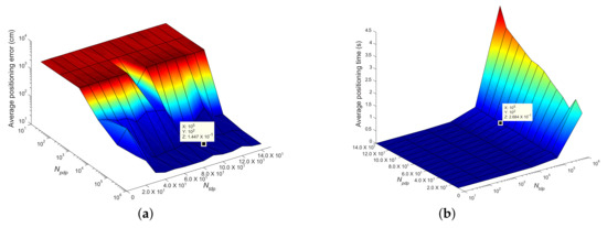 This subsection explores the effect of the number of the proposal distribution particles and the number of the target distribution particles of DSPF on the accuracy and execution time of our localization algorithm. Our experiments were executed to determine the optimal and needed to estimate the pedestrian position accurately and rapidly in test cases TC1 and TC2. In the experiments, the positioning accuracy and execution time were obtained from 30 runs of the positioning algorithm performed by DRC3 based on DSPF. They were calculated according to and to emphasize the effect of the change in and and to verify their optimal values, as represented in Figure 9a,b.