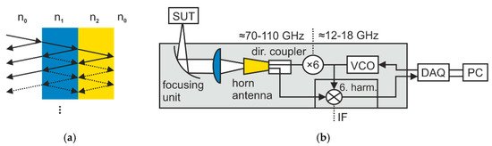 (a) Main (solid lines) and multiple reflections (dashed lines) within a multilayer sample under test (SUT) (b) Schematic of the measurement setup. VCO, voltage-controlled oscillator; DAQ, data acquisition unit; PC, personal computer; dir., directional; 6. harm., 6-th harmonic; IF, intermediate frequency.