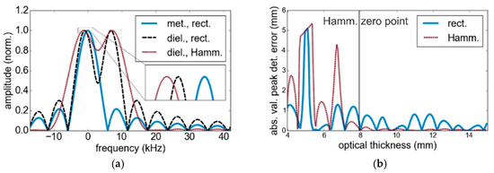 (a) Fourier amplitude spectrum of a single metal reflector (met.) in the calibration plane and a combination of two dielectric reflectors (diel.) with (Hamm.) and without (rect.) the application of a Hamming window function. (b) Peak detection error using a rectangular (blue) and a Hamming (red) window function.