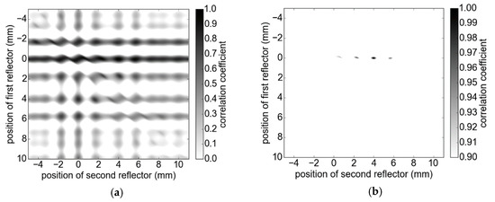 To resolve thicknesses close to the Rayleigh resolution limit and even below, a promising method is the correlation coefficient-based comparison of measurement signals and signal models, which represent the material structure of the SUT [18]. The highest correlation indicates the best approximation of the real positions and hence the evaluated thicknesses. Considering the simulated measurement scenario of two boundary surfaces in Figure 2a and given the assumption of only one main reflection per boundary surface, we calculated models for all potential positions of reflectors (brute force) within the correlation interval using an appropriate step size and compared them with the measured signal. Figure 3 depicts the solution space featuring numerous local maxima besides the global one. In order to achieve accurate results, a small step size of 25 µm was used. The amplitudes are given as and additional influences such as spurious echoes and the phase noise are not included. The global maximum of the correlation coefficient of 1 accurately represents the thickness of 4 mm, as can be observed in Figure 3b. In many applications, a reasonable prediction of the correlation interval can be given, which can significantly reduce computation time. However, the complexity increases exponentially for every additional material layer. Since the distance of a SUT to the measurement system may vary during the inspection, large correlation intervals may be required to compensate for positioning errors. An alternative approach is the dynamic adaptation of the correlation interval’s position. We used the position of the first peak as a rough estimate of the position of the first reflection and accordingly shifted the correlation intervals. This significantly reduced the computational load.