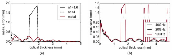 In order to investigate the influence of multiple reflections on thickness measurements, we performed model-based calculations of the measurement error as a function of the optical path length difference. A bandwidth of 38 GHz and a correlation interval between 0 and 7 mm with a step size of 1 µm were used. Figure 4a shows the measurement error for three different cases of a simulated single layer: and air, and air, as well as and metal plate. For the first case, the error is less than one percent for an optical path length difference larger than 1.5 mm. Using , and for thicknesses between 1.4 and 2 mm, the interference is significant and only one peak results from the processing. In Figure 4b, different modulation bandwidths for measurements of a layer with are considered. As the results indicate, the error increases with a lower bandwidth, due to the widened peaks. Because of the calculation results in Figure 4, for most cases, multiple reflections have to be considered in our signal model in order to obtain highly accurate measurement results (but in particular for high contrasts of refractive indices).