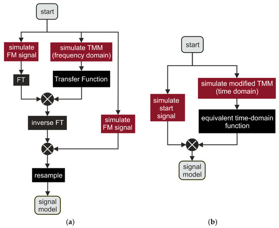 Wave propagation can be implemented using recursive approaches such as ray tracing (infinite sum of reflections) [28] or the Rouard method [3]. In contrast to these, our approach uses the iterative transfer matrix method (TMM) [29,30]. It is based on matrix multiplication, does not depend on intermediate data, and hence provides more flexibility for a fast graphics processing unit (GPU) implementation. Figure 5a shows a block diagram of the classical TMM calculation approach adapted to our measurement setup. A cycle of the frequency-modulated (FM) signal is simulated considering the Nyquist theorem, which corresponds to several tens of millions of time samples. The signal is then transformed into the frequency domain and multiplied with a transfer function resulting from a large transfer matrix. Afterward, the inverse Fourier transformation of the product and a time-shifted FM signal are mixed. To obtain the resulting measurement signal, the product is downsampled according to our sampling rate. The block diagram in Figure 5b illustrates our modified TMM approach which is derived in [31] in detail. In contrast to [29,30], an even more efficient calculation of the signal model is achieved by only calculating the matrix of the samples of the measurement signal. Here, the simulated FM signal is multiplied with a much smaller equivalent time-domain function resulting from the modified transfer matrix. This method is justified due to the conservation of the amplitudes of the reflections within the mixing process (comparison of Equations (2) and (3)) and the transformation of the reflections’ time delay into a frequency and zero phase shift.