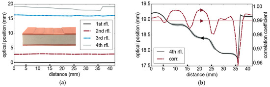 In a next step, we performed thickness measurements on industrial multilayer structures. The inset in Figure 6a depicts a cross-sectional view of a multilayer tube wall. It consists of two outer polyvinyl chloride (PVC) layers and a thick internal recyclate foam. A step wedge with approximately 300 µm step height and 1 cm step width was milled into the top outer layer. The SUT was measured from the side of the flat surface (bottom layer in Figure 6a), so that the layer with the step wedge represented the last layer of the structure. The average determined thicknesses from five repetitive measurements are depicted in Figure 6a. Figure 6b shows a magnification of the 4th reflector’s position and reveals the stepped shape of the tube sample’s back surface. The gray surrounding of the curve represents the standard deviation as the square root of the unbiased variance of five measurements. Due to the finite diameter of the terahertz beam (≈5 mm spot size), the edges of the steps appear as smooth transitions. The dashed line corresponds to the correlation coefficient from our signal model approach. While the signal model could potentially be further improved by more accurate information on the measurement setup and the material parameters, a coefficient larger than 0.99 already guarantees a high correlation. Besides the system parameters, further aspects such as the optical configuration will be considered in future works in order to improve the measurement results. Note that a comparative TDS thickness measurement was not possible for this specific sample due to a high absorption within the sample (considering the full spectrum) and the large sample thickness of roughly 1.3 cm exceeding the fast sampling range window of our TDS setup.