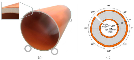 In order to verify our measurement approach and to prove its robustness against varying sample positions, we measured the wall thickness of a plastic tube along its circumference and compared the results to TDS measurements of the same sample in reflection geometry (≈1 mm focal spot size in air). The curvature of the sample itself as well as the different focal spot size of both measurement systems were not considered in the evaluation. The tube wall had a similar layer structure as the one discussed in Section 4.2 (Figure 6a)—without the additional steps on the back surface—but was significantly thinner. As schematically shown in the photograph in Figure 7a, the tube was placed on two pairs of wheels for rotation. In the case of the FMCW measurements, the sensor was positioned beneath the tube and pointing toward the tube wall perpendicular to the surface. Since the sample exhibited some eccentricity, the distance between wall and FMCW sensor varied significantly during tube rotation. For Figure 7b, we therefore used a concentricity gage to map the distance between the measured reflections and the center of the tube.