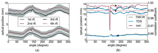 For the TDS measurements, the sensor was positioned above the tube and its distance was adjusted manually, in order to keep the sample within the measurement window of the fast sampling range of the TDS system. For the FMCW measurements, we calculated the first peak of the Fourier spectrum as an estimate to adapt the interval position, as indicated in Figure 8b by the gray areas surrounding the measured positions of the reflections. The variations of the first reflection can be estimated as 1.5 mm. Figure 8b, which compares the results of both techniques, shows an excellent agreement of the determined layer thicknesses. For a rotation angle of 135°, we could not obtain a clear result, which is possibly related to a seam in the outer layer of the tube wall. The measurements were taken manually in steps of 1 cm around the tube, which introduced slight deviations to the measurements by positioning errors. The TDS setup is characterized by a measurement time of 1 s per point (the FMCW measurement time was 200 µs) by a bandwidth of up to 4 THz using a Rouard method-based signal processing algorithm [3].