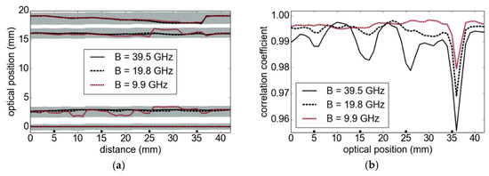 The increasing availability of highly integrated millimeter-wave radar sensors based on MMICs with considerably large frequency modulation bandwidths provides a high potential for widespread application of the underlying thickness measurement technique. While the full available bandwidth of 39.5 GHz and measurement rate of our sensor is still superior, we deliberately reduced the processed bandwidth in an additional measurement scenario with the same sample as introduced in Section 4.2. Figure 9 shows the results obtained with different reduced FMCW bandwidths. Even 19.8 GHz is sufficient to resolve the layers of the structure in Figure 6a very accurately. In contrast, the results with an even smaller bandwidth of only 9.9 GHz show strong deviations, in particular for the second and third boundaries. The gray areas in Figure 9a correspond to the correlation intervals of our signal processing approach. As indicated in Figure 9b, the correlation coefficient also becomes less sensitive to the stepped structure at lower modulation bandwidths. We expect to obtain better results by considering the optical aspects of the measurement setup and a better estimation of the material parameters, which have not been accessible as single layers. However, as part of our future work, we want to evaluate the material parameter using measurements of multilayer composition as done in [15].