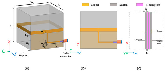 As shown in Figure 1a, the antenna is fed by a microstrip line realized on a Kapton film. Since the magic cube width (W1) = length (L1), total loop length = 4 W1, and loop width = W2. Figure 1b shows the front view, where the microstrip line was realized with a sub-miniatured version A (SMA) connector. As shown in Figure 1c, three Kapton films were bonded, and the overall substrate thickness was 0.52 mm because the thickness of Kapton (tk) and bonding films (tb) were 0.12 mm and 0.08 mm, respectively. The width (W3) of the microstrip line was designed to have 50 Ω characteristic impedance. If the thickness was too thin, it was difficult to fabricate a 50 Ω microstrip line because of a narrow W3. Therefore, we set W3 to be 1.2 mm with the overall substrate thickness of 0.52 mm.