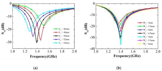 Simulated S-parameters of the proposed loop antenna at different parameters of (a) L1 and (b) W2 in the unfolded state.