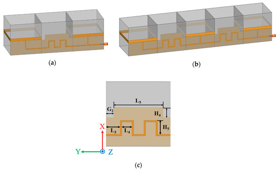 Figure 3a,b show illustrations of the two-element antenna array and three-element antenna array, respectively, and Figure 3c shows the layout of the series feeding line. The geometrical parameters of the single antenna in Figure 1 are W1 = H1 = L1 = 50 mm, W2 = 4.5 mm, W3 = 1.2 mm, H2 = 8 mm, H3 = 22.15 mm, L2 = 25.6 mm, and G1 = 0.6 mm. The radiation pattern of the single antenna was omnidirectional, a bi-directional radiation pattern was obtained with the microstrip fed loop antenna configuration for the two-elements and three-elements antenna array. The two-element antenna array was realized by connecting three identical origami magic cubes as shown in Figure 3a. Figure 3b shows the series feeding line to achieve a maximum peak gain of the proposed antenna array. Figure 3c shows the interconnect line between magic cube antennas. For impedance matching, its geometric parameters, shown in Figure 3c, are L3 = 9 mm, L4 = 9 mm, L5 = 38 mm, H4 = 7.85 mm, H5 = 12.8 mm, and G2 = 6 mm.