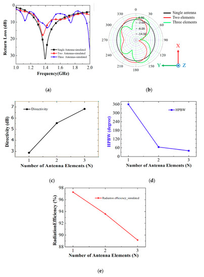 Figure 4a shows the simulated return loss for the single antenna and for the two-element and three-element antenna array. The return loss was higher than 10 dB in the range of 1.29–1.54 GHz, 1.31–1.45 GHz, and 1.32–1.48 GHz for the single antenna and the two-element and three-element antenna array, respectively. Figure 4b shows the simulated 2D radiation patterns for the single antenna and for the two-element and three-element antenna array on the XY plane at 1.39 GHz; the peak gains were 2.91, 5.14, and 5.91 dBi, respectively; the half power beam widths (HPBWs) were 360°, 65°, and 40°, respectively. The asymmetric pattern of the three-element array was due to undesired radiation from the feeding lines. Figure 4c, d show the directivities and HPBWs for different numbers of the elements. Directivity increased and HPBW narrowed as the number of antenna elements increased, whereas the peak gain was only slightly increased above the three elements case due to the dielectric loss. The radiation efficiencies for the three loop antennas are presented in Figure 4e. The radiation efficiency decreased as the number of antenna elements increased because of the dielectric loss and feeding loss.