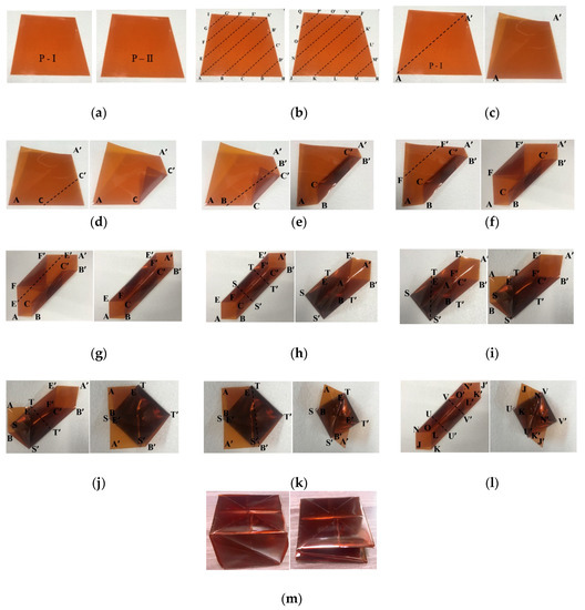 - Folding along CC', then BB', FF', and EE', consecutively, produced hexagonal geometry with 4 shorter sides (AB, AE, A'B', A'E'), as shown in Figure 5d–g.