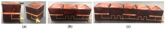 Fabricated samples: (a) Single antenna element, (b) two-element antenna array and (c) three-element antenna array.