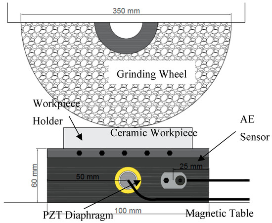 The present work is an expansion of the research activities described in Viera et al. [16,29], where initial results were presented. Therefore, the scope of this research work is to illustrate a new broader approach for the real-time monitoring system of the surface quality of ground ceramics using the low-cost PZT diaphragm. In this context, the results of the time–frequency analysis, obtained through the short-time Fourier transform (STFT), are used as the basis for the computation of the ratio of power (ROP) metric, which is considered an important metric in the frequency domain. However, in the present work, the ROP was computed in the time domain based on the study of Thomazella et al. [30], who conducted a pioneer work with the time–frequency approach along with the time domain ROP for monitoring self-vibrations on ground steel workpieces. The application of the technique in the monitoring of the ceramic grinding process in order to estimate the workpiece surface quality represents a novel approach for the manufacturing field. Moreover, this work differs from [30] because of the use of the low-cost piezoelectric diaphragm instead of the accelerometer. In addition, in order to verify the effectiveness and reliability of the proposed approach, an acoustic emission (AE) sensor, consolidated in the monitoring of manufacturing processes, was used. This paper is organized as follows: A ceramic grinding overview is presented in Section 2. Section 3 and Section 4 describe the piezoelectric diaphragms and the signal processing techniques used in this study. The experimental setup is shown in Section 5. Section 6 presents the results and discussion. Finally, the conclusions are presented in Section 7.