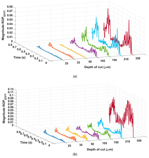 The ROP results, applied in the selected frequency bands for both sensors, are shown in Figure 5. A higher ROP level can be clearly observed as the depth of cut increases. The results of the three slight cutting conditions presented low magnitudes, while moderate and severe conditions showed a greater magnitude and peak-to-valley distance. This behavior results from the accumulation of chip in the cutting region, which generates higher cutting force, AE activity, and surface roughness. Thus, the grinding of ceramic components at a depth of cut of 350 μm generated the highest levels of ROP, STFT, and Ra.