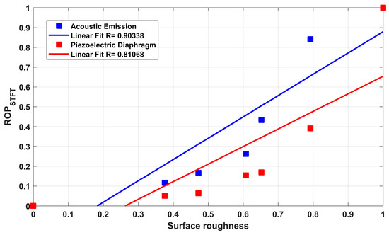 A linear regression was performed and the coefficient of determination (R) was calculated in order to show the similarity between the measured surface roughness and the signals of each sensor, as shown in Figure 7. The coefficient of determination was 0.90338 for the AE sensor and 0.81068 for the PZT diaphragm. Although the linear fit was better for the AE sensor, there is a high coefficient for both sensors, which is also confirmed by the coherence of Figure 6. Thus, the ROP metric can contribute to the evaluation of the surface quality of the ground ceramic components, as indicated in the results obtained by the linear regression. The linear fit was close to 45°, i.e., R very close to 1, indicating a high correlation between the signals and the measured roughness, which is the focus of this study. As expected, the AE sensor showed a better response to the acoustic activity generated during the grinding process, which is related to the surface quality of the workpiece, because of the metal housing, filter, and signal unit, which improve the signal conditions. However, the signals from the PZT diaphragm, studied in this work, showed a high degree of correlation (greater than 80%), confirming the feasibility of using the low-cost PZT diaphragm in the monitoring of the surface quality of ground workpieces through the acoustic activity generated during the process. The PZT diaphragm was able to detect the same changes in acoustic activity as the AE sensor.