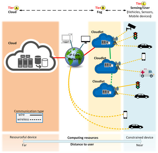 In this scenario, a route management service that takes advantage of the features of the Fog computing paradigm is extremely desirable in ITS. This happens because the Fog computing paradigm moves its resources (storage and processing) to the edge of the network, thus bringing the available resources as close as possible to end-users without the assistance of the Internet [11]. The Fog computing paradigm is based on entities named Cloudlet which have processing and communication capabilities (e.g., micro-data centers) and are geographically distributed to be closer to the access networks [18]. Since Cloudlets resources are closer to the end devices, they allow a faster response time and a local service decision. Thus, the Fog paradigm provides geo-computation and faster and less costly communication when compared to a Cloud. Although the Fog paradigm has lower computing capacity when compared with the Cloud, they can use the Cloud data centers whenever necessary. This approach forms a multi-tier architecture (see Figure 1), which is hierarchically organized with varying types of capabilities and end-user proximity. Cloud computing, represented in Figure 1 Tier A, possesses a more powerful resource, however the longer distance to retrieve data and the presence users beyond congested connections due to the use of the Internet often limit the real-time services and increase the network cost, especially considering a high dynamic vehicular network topology. Fog paradigm and Cloudlets environment are shown in Figure 1 Tier B, where the resources are closer to the end devices permitting a faster response time and a local service decision. Finally, users and sensors devices (e.g., vehicles, road sensors, cameras) are represented in Figure 1 Tier C.