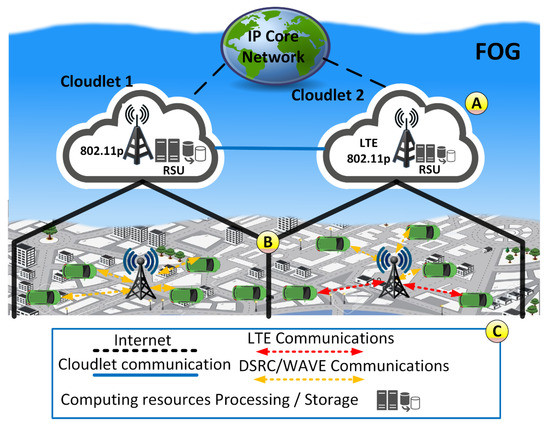 - Brennand, C.A.R.L.; Boukerche, A.; Meneguette, R.; Villas, L.A. A novel urban traffic management mechanism based on FOG. In Proceedings of the 2017 IEEE Symposium on Computers and Communications (ISCC), Heraklion, Greece, 3–6 July 2017; pp. 377–382. [Google Scholar]