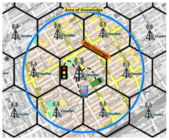 In order to perform Data Gathering, we need to deploy the RSU infrastructure, that is, the Cloudlets. After the deployment process, the Cloudlet gathers road/vehicle data.For this implementation, we use a set of RSU with Cloudlet capability spread homogeneously in the environment to achieve full coverage of the entire map (see Figure 4). Each Cloudlet is composed of a single RSU with communication capability to others RSUs and with vehicles. The communication between RSU is made by wire and RSU—Vehicle communication uses 802.11p wireless communication. Vehicles are equipped with GPS and On-Board Unit (OBU), which is a device mounted on vehicles that has processing power and allows DSRC communications with other OBUs or RSUs. Cloudlets are responsible for collecting all data generated inside its communication coverage (represented by hexagons in the Figure 4).