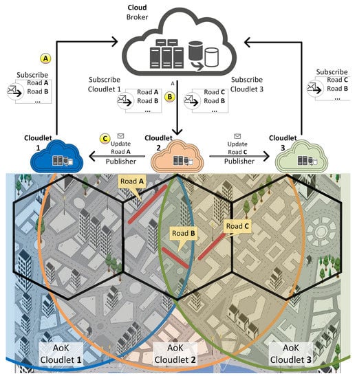 Note that each Cloudlet only classifies and updates the weight of the roads in its coverage area. To update roads on its AoK outside its coverage, Cloudlets share the road knowledge between them using publish/subscribe paradigm [43]. Subscribers register in events and asynchronously they are notified of events generated by publishers. The publish/subscribe protocol developed to FOXS has based on MQTT (Message Queuing Telemetry Transport) [44]. For that, all Cloudlets in the system are publishers, subscribers and the Cloud server is the broker (see Figure 5). In the beginning, each Cloudlet subscribes in the road update process by sending a road list including all roads inside its AoK except for roads inside its radio coverage (represented by hexagons). This list is sent to the Cloud server that has global knowledge of the map division (represented in Figure 5, Label A). After, the Cloud server notifies each Cloudlet (publisher) that is responsible for each road from the received list (see Figure 5, Label B). Cloudlets (publisher) notify all Cloudlets that are subscriber about road updates (see again Figure 5, Label C). Note that several Cloudlets may be intersected on the same path. The publish-subscribe method is an intesrting choice for ITS because of its asynchronous nature. The method also has the ability of work with context-aware applications, since interests flows considering a specific geographic region [45].
