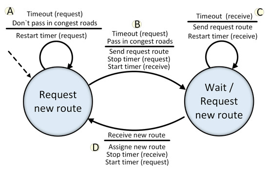 Hence, at each route interval, the vehicle checks if its route passes through a congested road. The service delivery mechanism is illustrated in Figure 6. If it does not pass (Figure 6 stage A), the router interval is restarted. Otherwise, a message is sent to the closest Cloudlet requesting a new route and recovery time is started (Figure 6 stage B). The recovery time is a fault-tolerance mechanism that checks if the vehicle has received the requested route within a specific time interval. A new request message is sent in case of failure to receive (Figure 6 stage C). When the vehicle receives the new route, it is assigned and the route interval time is started (Figure 6 stage D).