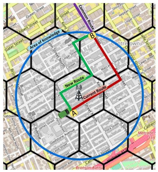 Therefore, the Cloudlet computes a new route for the requesting vehicle in the scope of its AoK, that is, only using roads within the blue circle. Thus, the rerouting process does not change the part of the route outside of the AoK in purple (standard route). As we can see in Figure 7, the routing of vehicles (e.g., green car) is performed considering its current position (point A) until the last road in its current route that is within the AoK of the Cloudlet (point B).