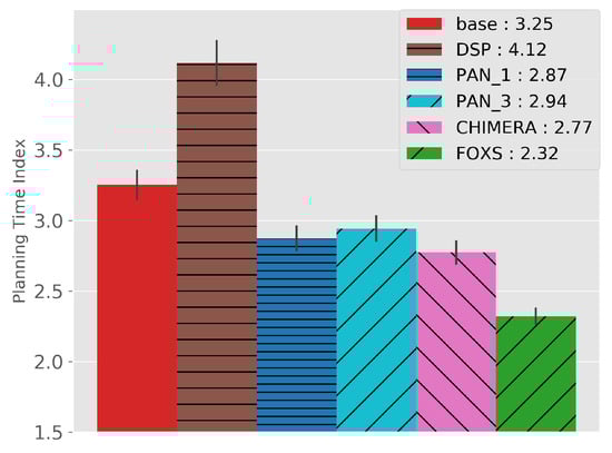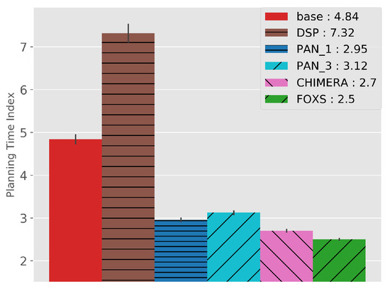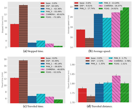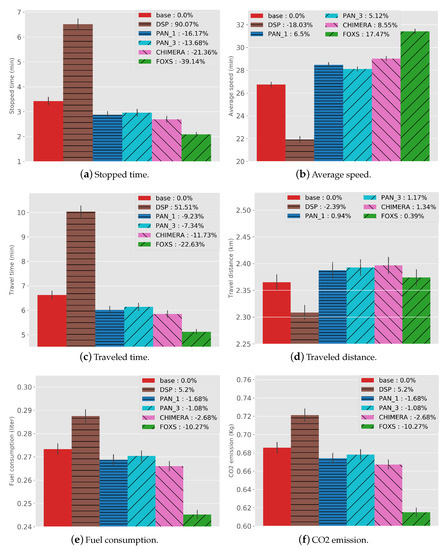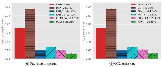 As expected, DSP reduced the distance traveled (2.32%) and the PAN1 and FOXS had the lowest route increase with 1.35% and 1.53% respectively (Figure 17d). Note that CHIMERA increases the route size in 3.78% related to BASE and 2 times related to FOXS. This is because CHIMERA does not have a mechanism to evaluate the size of the route as FOXS. The Stopped time (Figure 17a) was reduced for PAN1 (62.36%), PAN3 (55.49%), CHIMERA (65.62%), FOXS (73.18%) and the Average speed (Figure 17b) was increase PAN1 (17.74%), PAN3 (13.24%), CHIMERA (19.37%) and FOXS (24.92%) in relation to BASE. Note there is a high difference between FOXS, PAN1, PAN3 and CHIMERA to BASE. This is caused by the large volume of vehicles on the scenario and by the great impact generated during the choice of alternative routes since the roads have a quite different size. However, FOXS chooses better routes than all solutions because it considers the size of the new route beyond the route classification. The profit reached by FOXS in previous metrics is reflected in the improvement of the fuel consumption (reducing 28.25%, Figure 17e), of the CO2 emission (reducing 28.25%, Figure 17f) and of the travel time (reducing 53.53%, Figure 17c). About the PAN1 and PAN3, which differ only by the alternative routes, it was observed that for a real scenario, the random choice of a set of best routes does not provide a good result as presented in Figure 17.